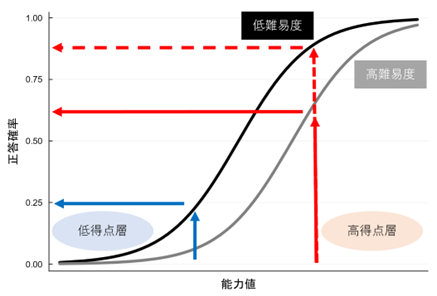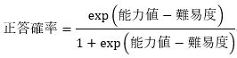 素点は試験版の難易度の影響を接的に受けるため,複数の試験版を利用する場合にたまたま易しい試験版に割り当てられた受験者にとって有利になる恐れがあります。この不公平を解消するためには,試験版ごとの難易度を調整したうえで素点に代わる受験者の得点を利用すればよいです。試験版ごとの難易度を調整するためには,まずは試験版と試験問題そのものの難しさを知る必要があります。しかし,平均点や通過率(参照: 「第1回:CBTの特徴と良質な試験問題の作成について」)といった指標は受験者集団の能力レベルに左右されるため,より客観的にこれらの難易度を評価できる枠組みが必要となります。それがIRTです。 IRTによって試験の正誤データから,通過率とは異なる,集団のレベルに依存しない試験問題の難易度を知ることができます。正答と誤答のいずれかで採点されている多肢選択式の試験問題を例にとって,IRTの考え方について説明します。IRTでは,1つの試験問題に正答できる確率を試験問題の難易度と受験者の能力値という2種類の要因に分解して数式で表現します。