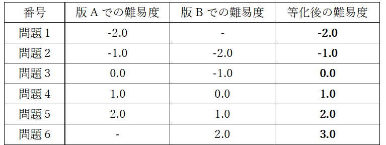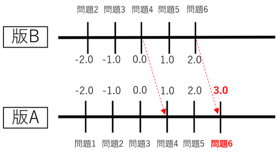 ところで,IRTの難易度と能力値には,全く同じ正答率になる組み合わせが無数に存在します。例えば,1パラメタ・ロジスティックの式では試験問題の難易度の値と同じ能力値の受験者の正答確率は0.5(50%)となりますが,この時の難易度と能力値の具体的な数値は0でも1でも良いため,何もしなければどれかひとつの値に定めることができません。そこで,一般的には試験版の平均難易度がちょうど0になるように試験版の難易度の中心点を定めています。平均難易度を基準にすると,試験版に含まれる他の問題の組み合わせが変われば,たとえ同じ試験問題であったとしても,その試験版の中で計算される難易度の数値は変化します。異なる試験問題の組み合わせからなる試験版で難易度の数値の意味合いを共通化する作業が等化であるとも言えます。