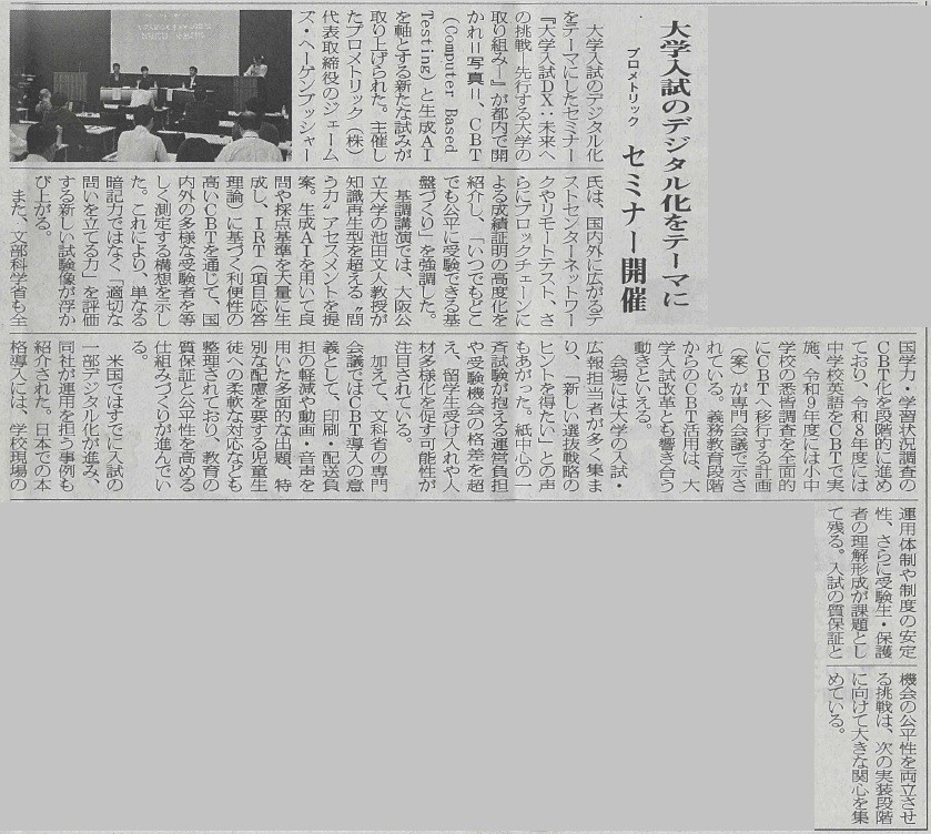 プロメトリックが開催した大学関係者向けセミナー「大学入試DX:未来への挑戦~先行する大学の取り組み~」の様子が、教育学術新聞(2025年9月10日付 / 第3020号)に掲載されました。大学入試のCBT化や公正性・信頼性を両立する評価の在り方について、登壇者と参加者による活発な議論が交わされました。